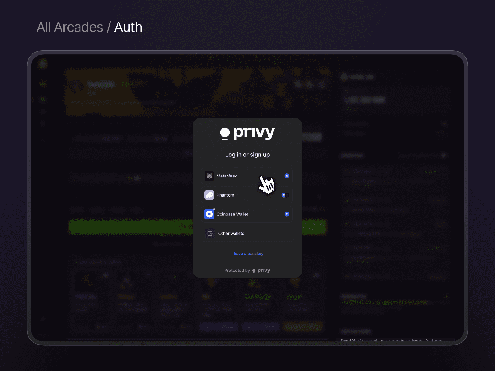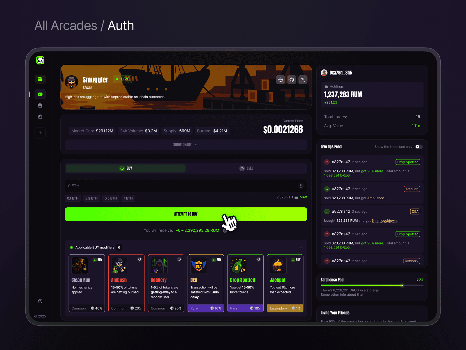 I structured the arcade layout, token cards, states (Live / Pre-sale / Coming Soon), Safehouse pools, risk signals, odds visualization, and modifier reveal moments.