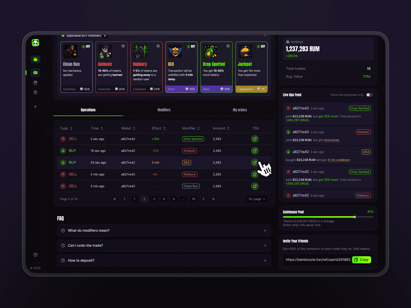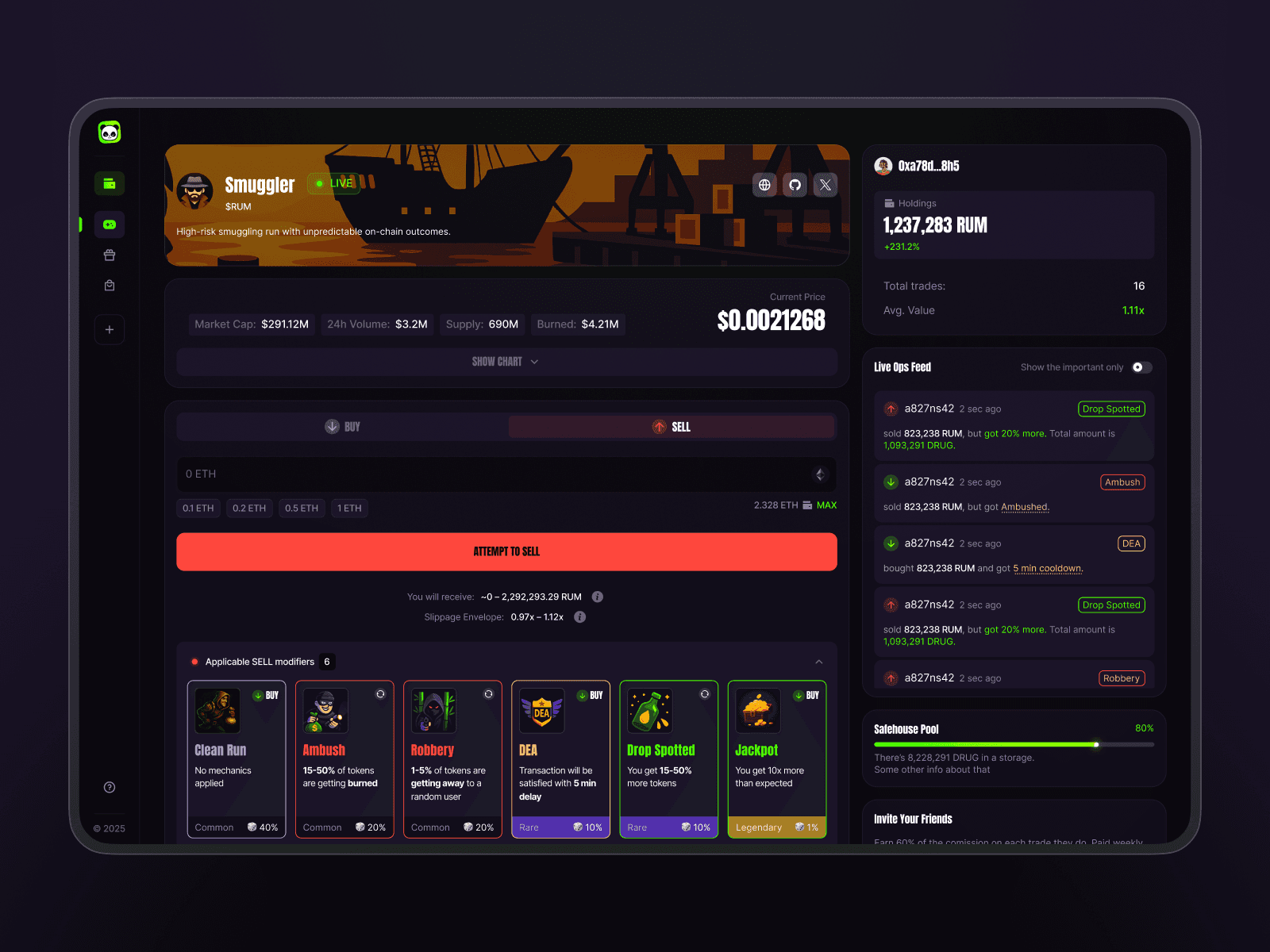 Each token is its own mini-game, so I built a modular illustration and icon system. Every mechanic received a custom icon in a unified style, including ambushes, robberies, DEA raids, clean escapes, drops, and jackpot events. The visual language blends meme energy with sci-fi/arcade aesthetics, making the platform feel playful, risky, and instantly recognizable.