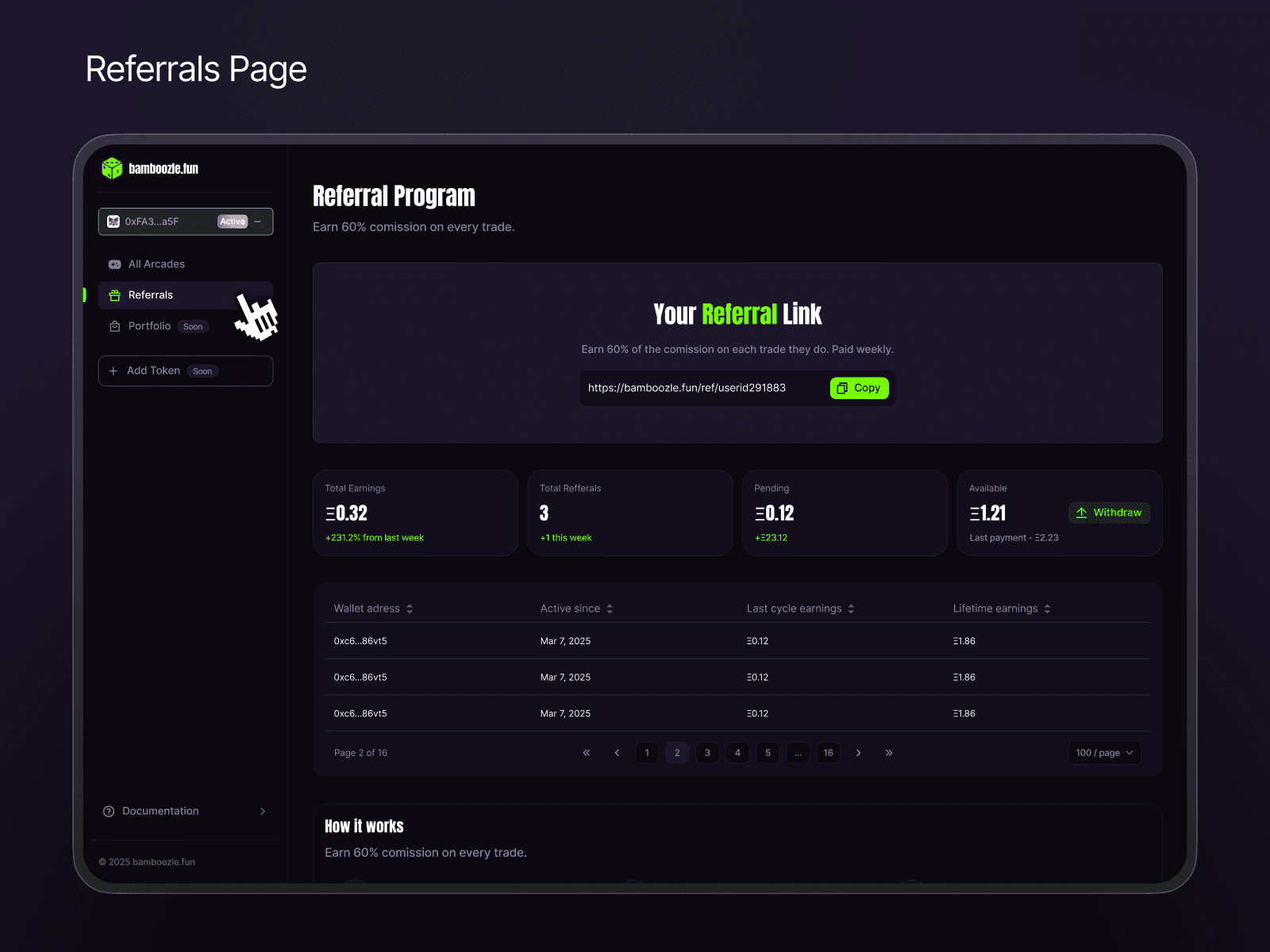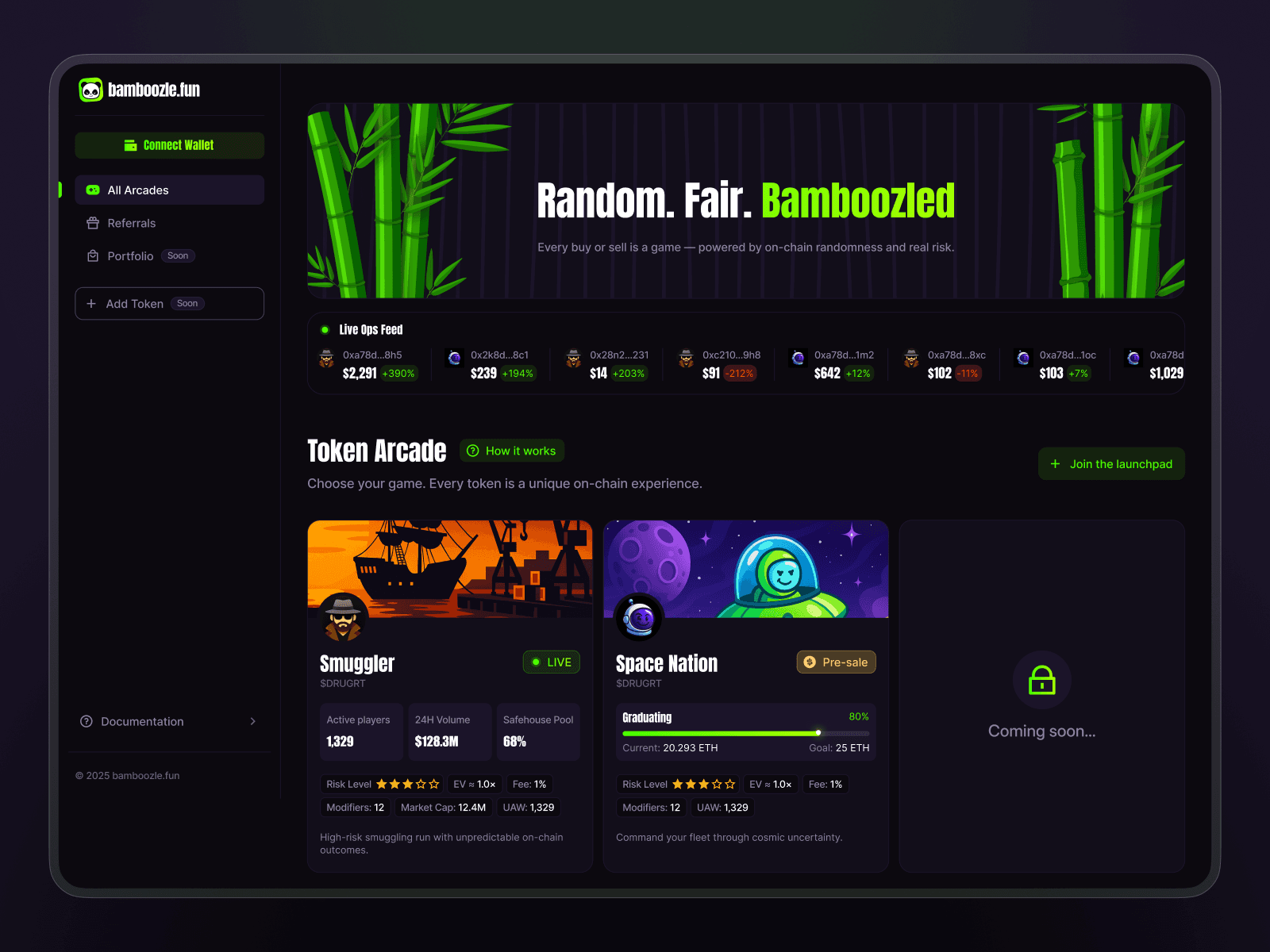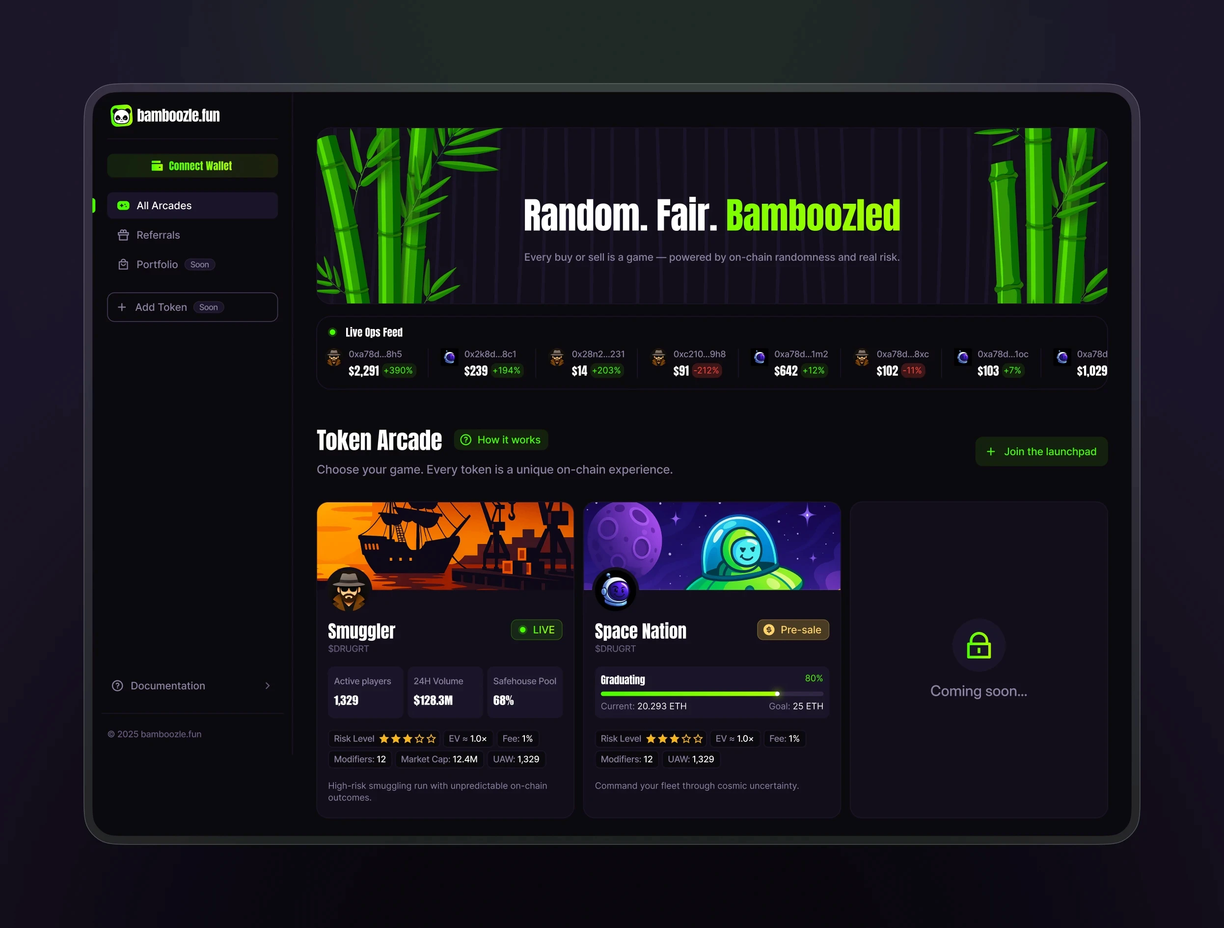 I designed the full visual identity, UI system, and game experience for bamboozle.fun, a token arcade where every buy or sell triggers a unique on-chain event. The project included brand creation, mechanics visualization, token cards, modifier icons, and the complete UX for the arcade hub.