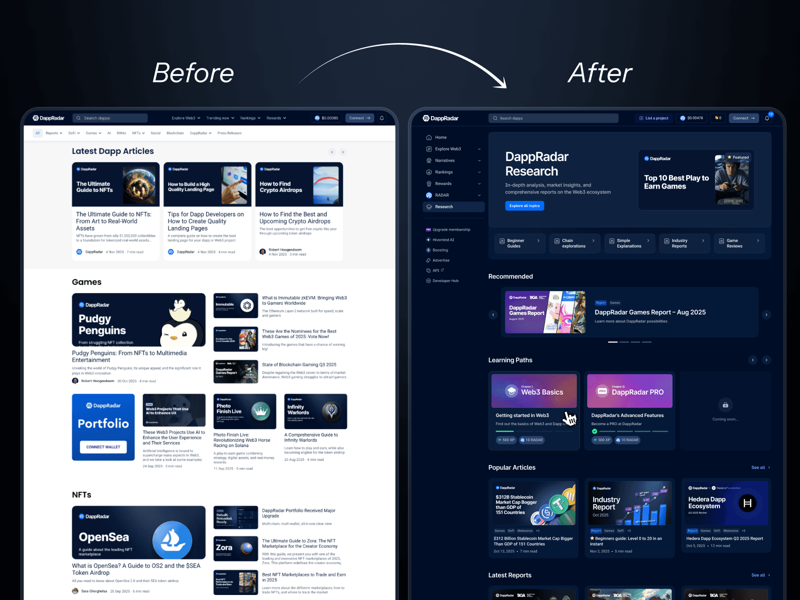 DappRadar Research is the redesigned evolution of the old DappRadar Blog — transformed into a structured, data-driven insights hub built entirely on top of the platform’s existing architecture.