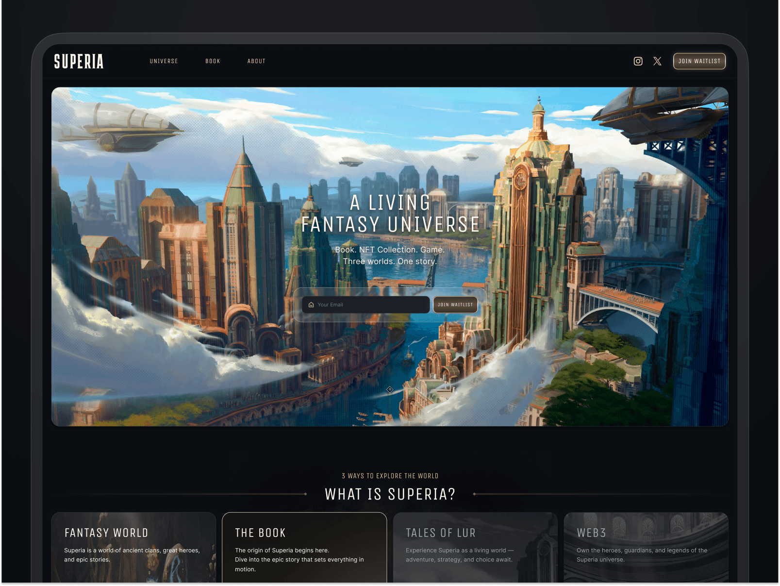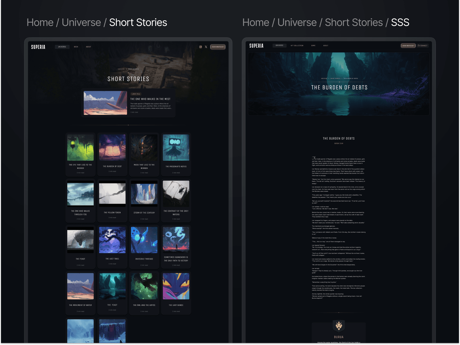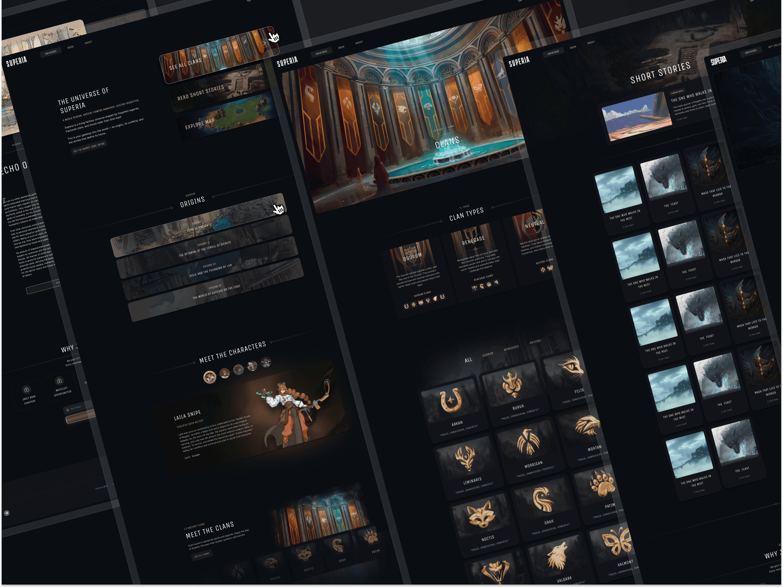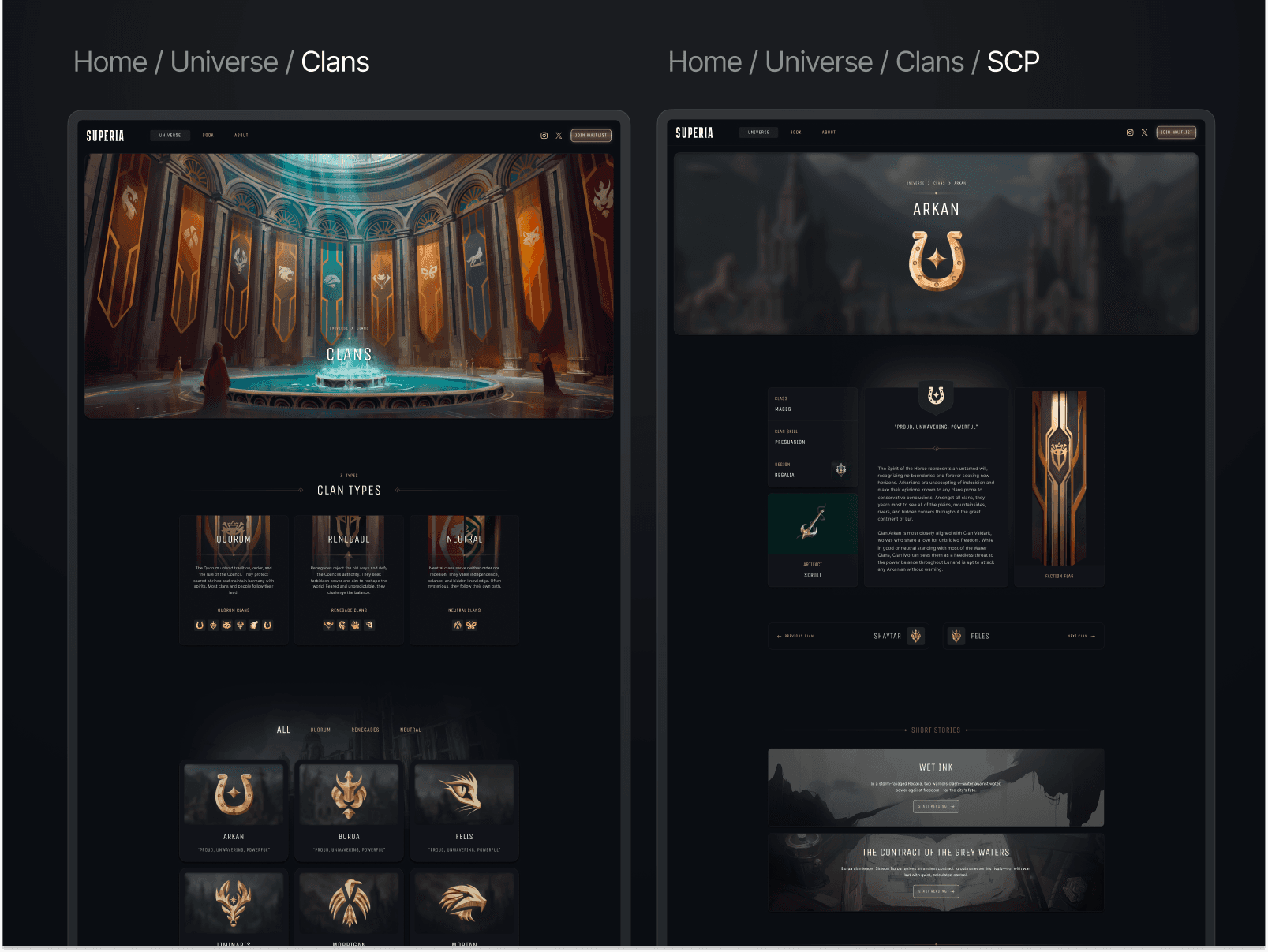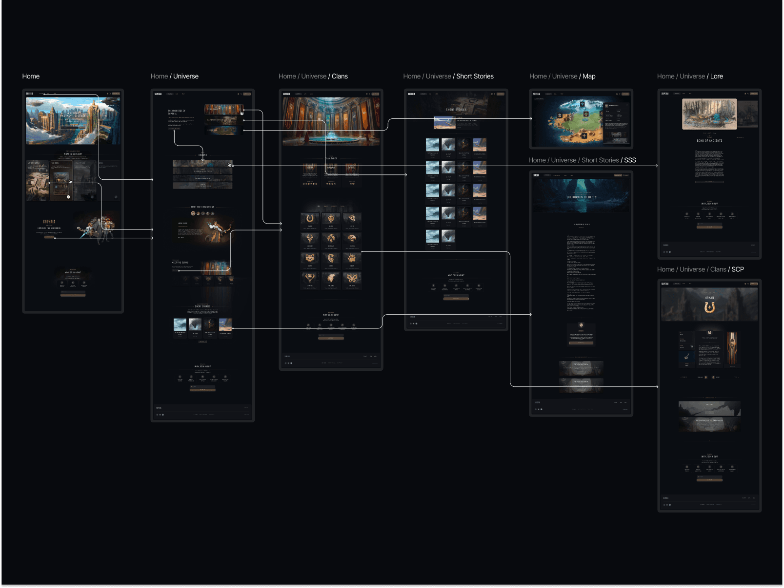 The public release includes origins, clans, key characters, a world map, and a library of short stories. I designed the visual direction and product structure – core screens, information architecture, and navigation flows.